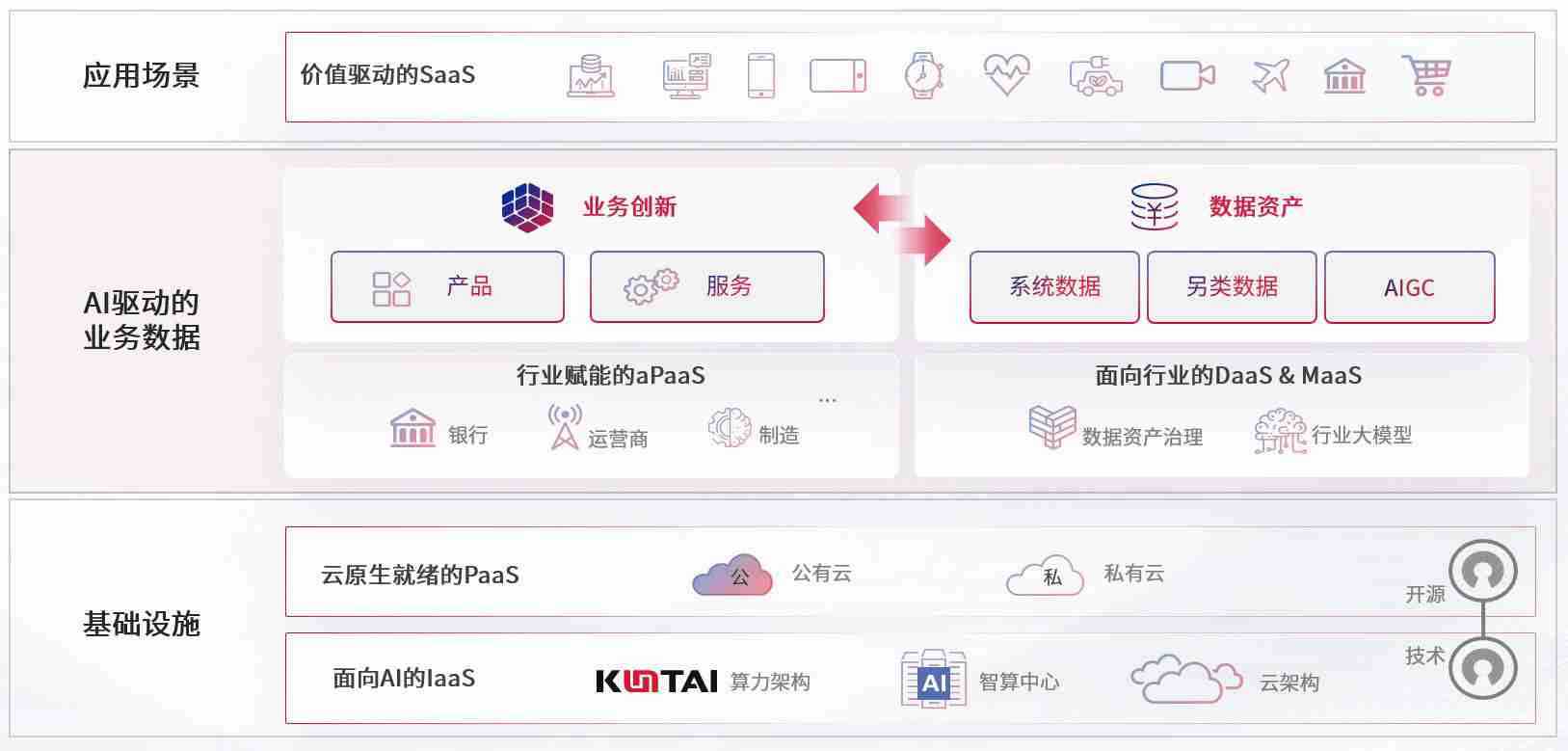 数字时代,,,围绕企业数字化转型的关键要素,,,壹号娱乐数码开创性的提出数云融合战略和技术体系框架,,着力在云原生、、数字原生、、AI原生和信创产业上架构产品和服务能力,,为处在不同数字化转型阶段的快消零售、、、、汽车、、金融、、、、医疗、、政企、、教育、、、、运营商等行业客户提供泛在的敏捷IT能力和融合的数据驱动能力,,构建跨界融合创新的数字业务场景和新业务模式,,助力企业级客户建立面向未来的核心能力和竞争优势,,,,全面推动社会的数字化、、、、智能化转型升级。。