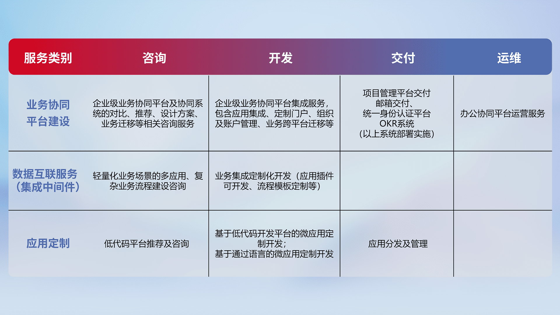 针对钉钉、、、、企微、、、、IDaas等平台级产品提供产品的规划、、、、方案、、交付、、、定制化开发等服务,,,,实现如统一协同办公、、智能客户服务、、、混合会议管理、、、、智能数据查询、、、等业务场景,,,实现数字化转型。。。